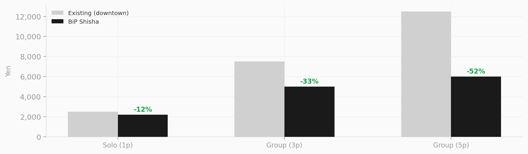 | パーティ(6人・4台) | 8,000円 | 1,380円 | 6,620円 | 17% |