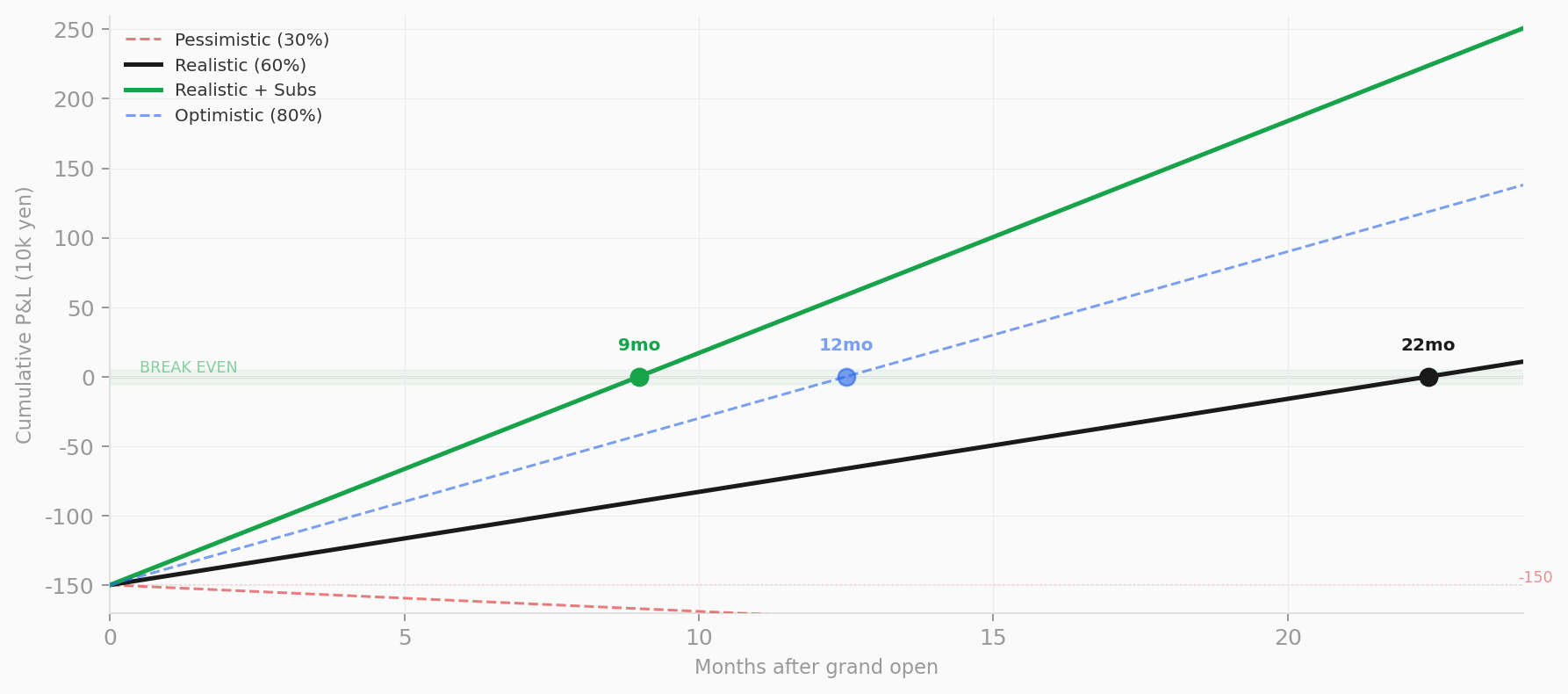 | 現実的 + サブスク20人 | +16.7万円/月 | 約9ヶ月 |